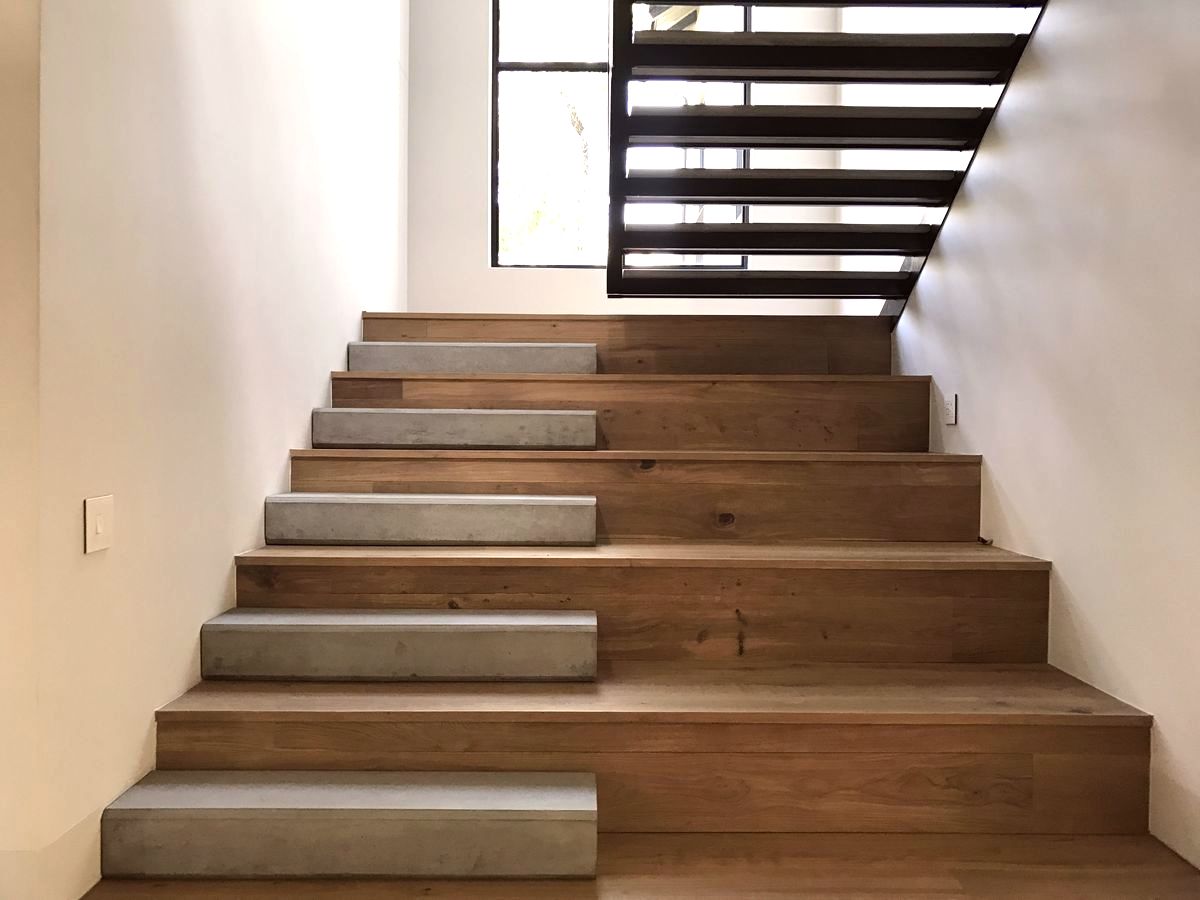 Второй интересный вариант дизайна — первые ступени лестницы оформить как подиум, широкими, не стандартными по размеру, ступенями. Такая лестница как бы приглашает наверх, распахивает свои объятия навстречу жителю. Это видно на следующем фото.