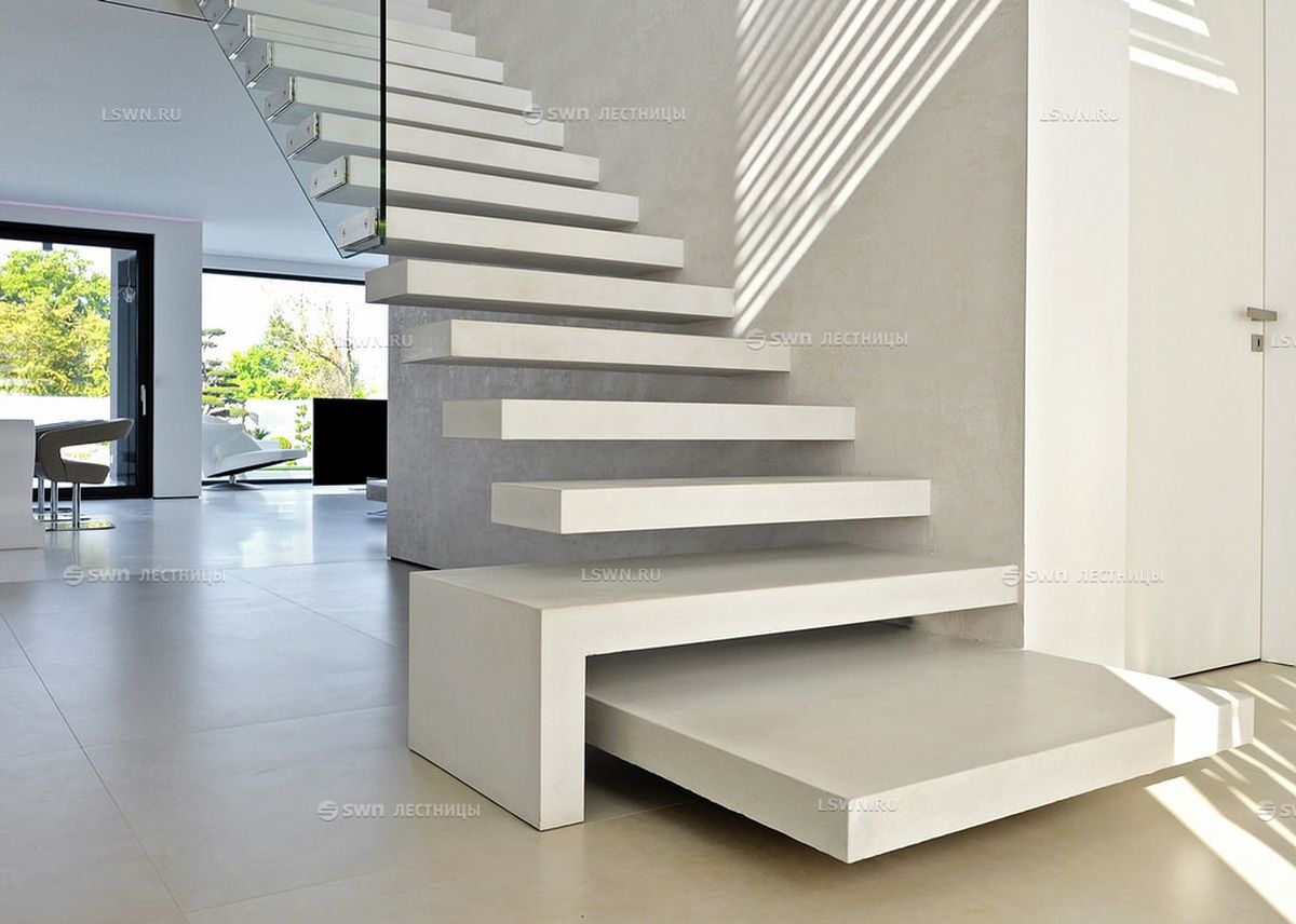 Рекомендую в домах с современной архитектурой применить дизайн, когда ступени нижнего марша продлеваются до второй стены, через один. На этих ступенях можно посидеть, или поставить на них вазы, сделать декоративную композицию. Ступени верхнего марша, по контрасту с нижним маршем, делаются легкими и прозрачными. Этот прием хорошо виден на фотографиях. Просто, недорого и... при этом, очень красиво и оригинально.