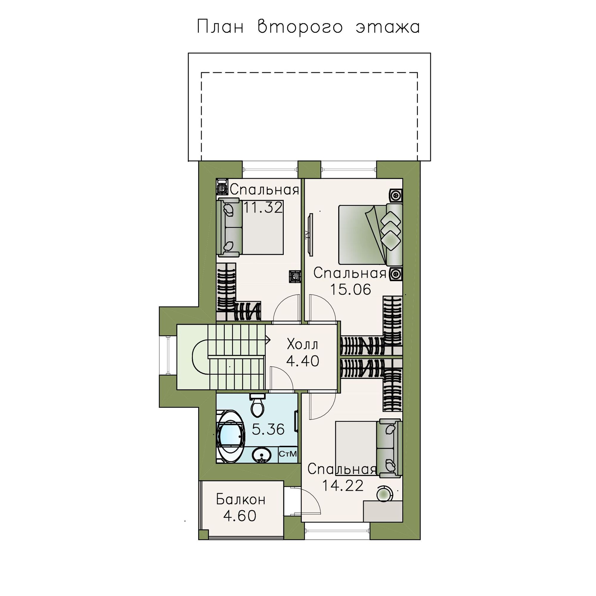 Все проекты мы стараемся делать ПРОПОРЦИОНАЛЬНЫМИ по площадям. Чем больше общая площадь — тем больше площади спальных, или их количество, тем шире лестница, тем больше прихожая и больше гардероб в ней...