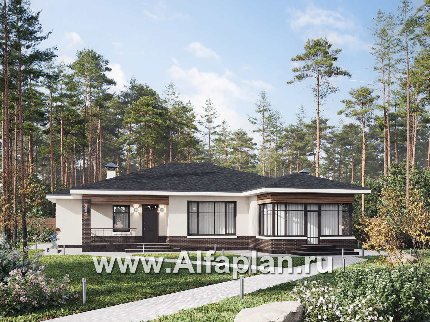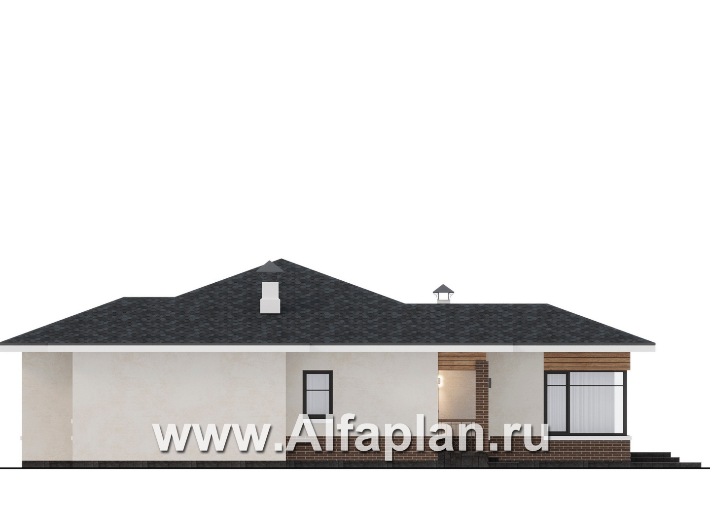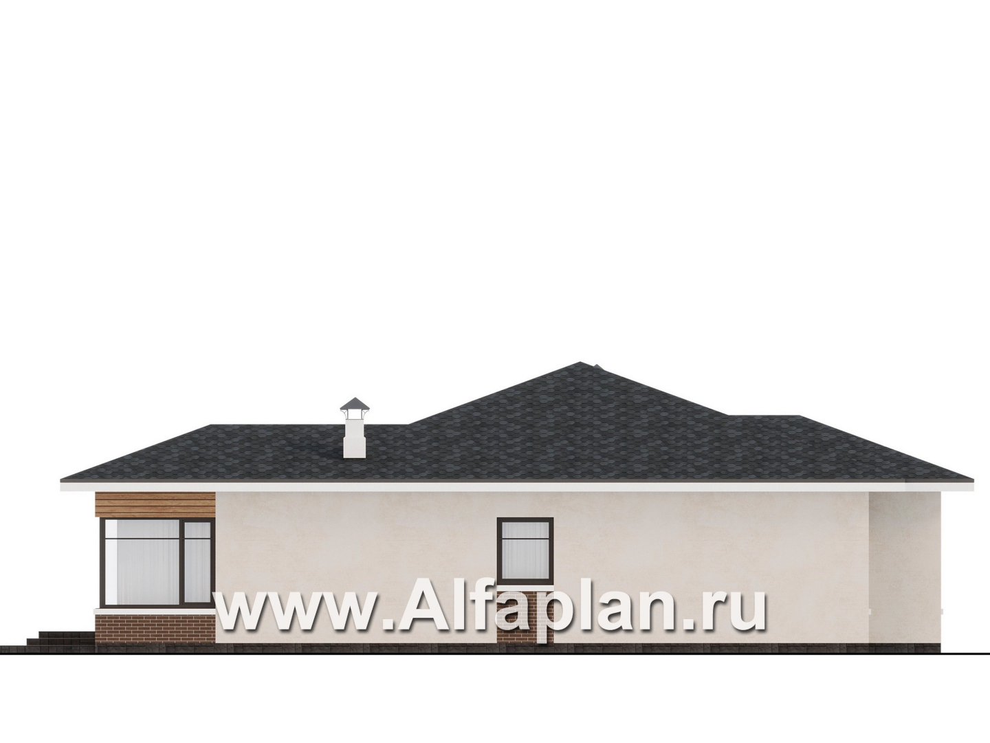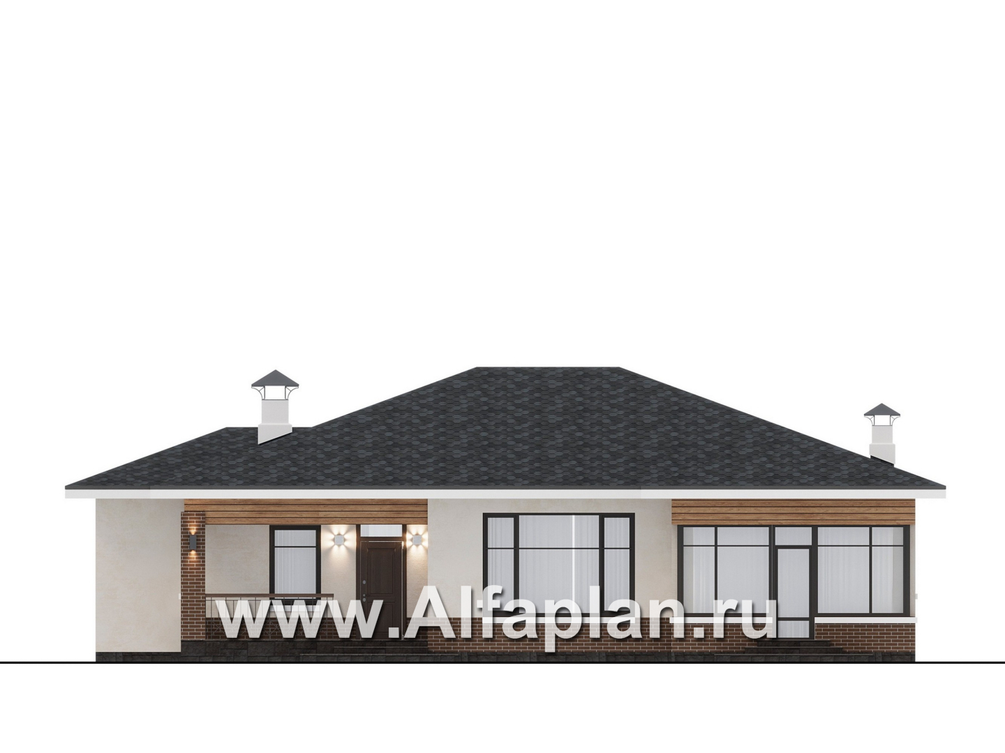 Фасад современного одноэтажного дома 610А «Эрато» запоминается портиком террасы на главном фасаде, и красиво оформленным входом в дом. Традиционно для Альфаплан, облицовка стен, на террасе и возле крыльца, выполнена деревянной вагонкой. Фасады выполнены в отделочном кирпиче.