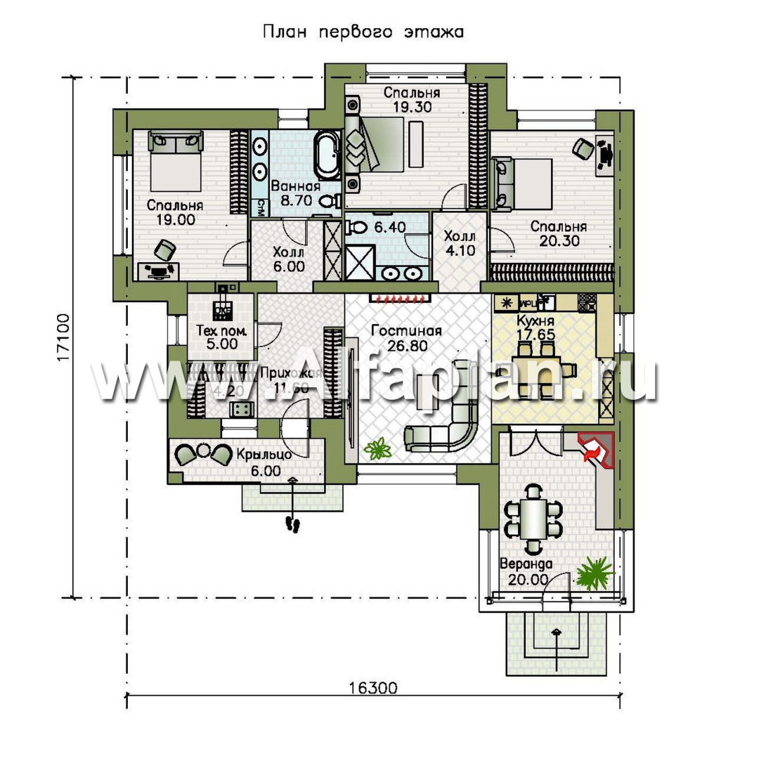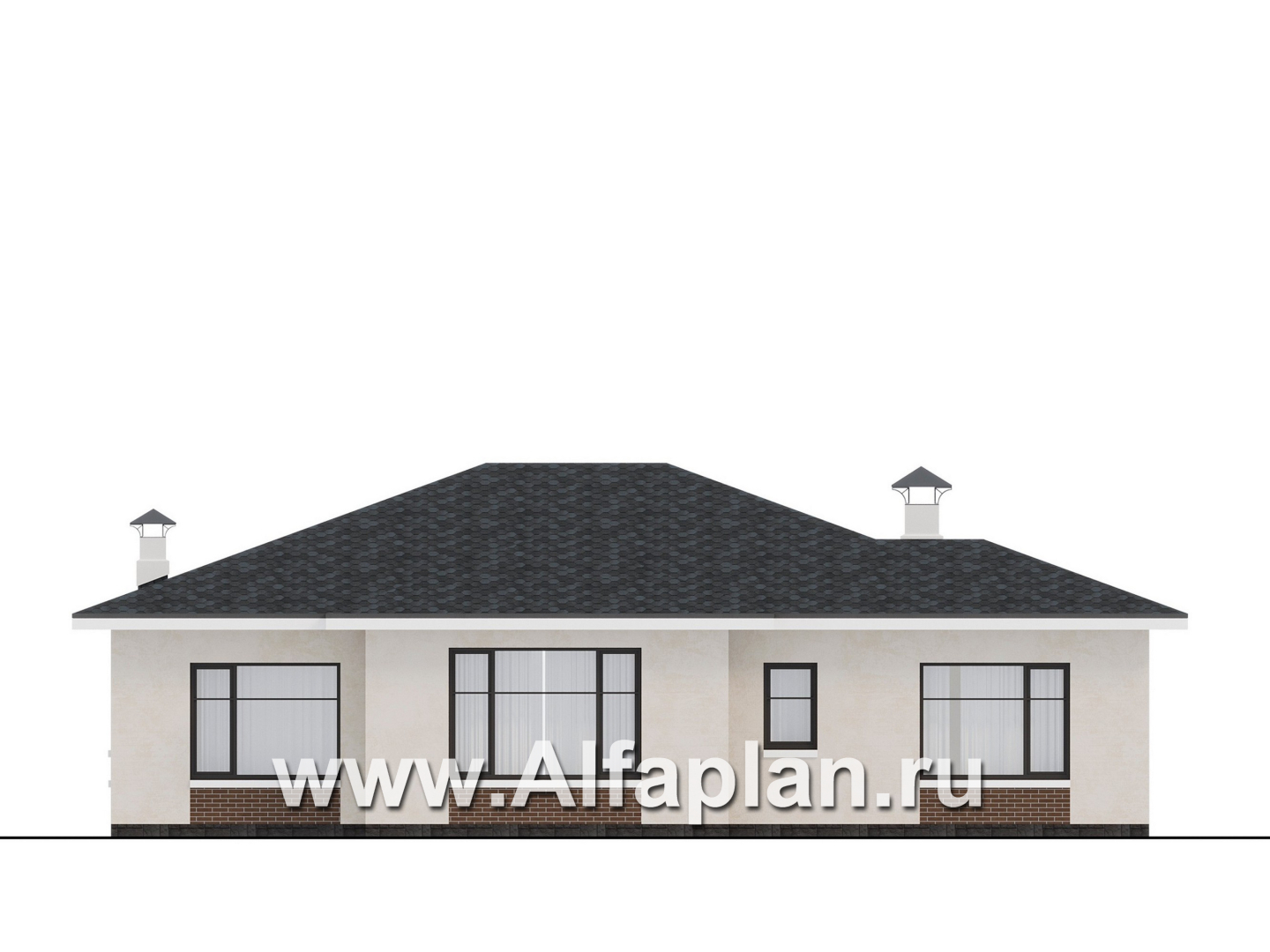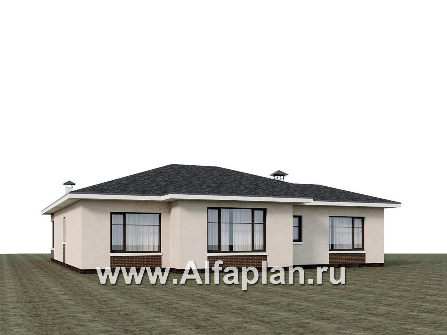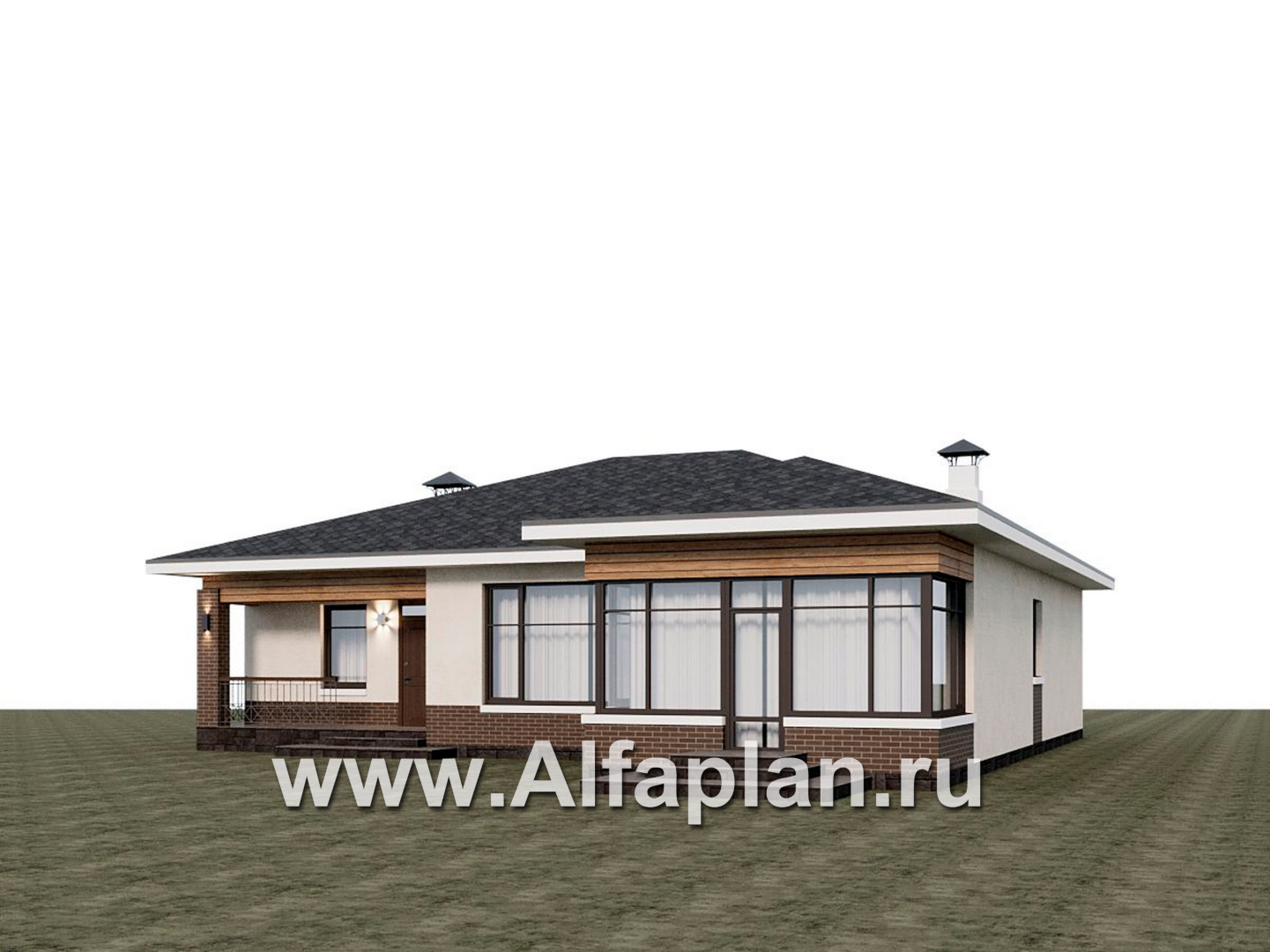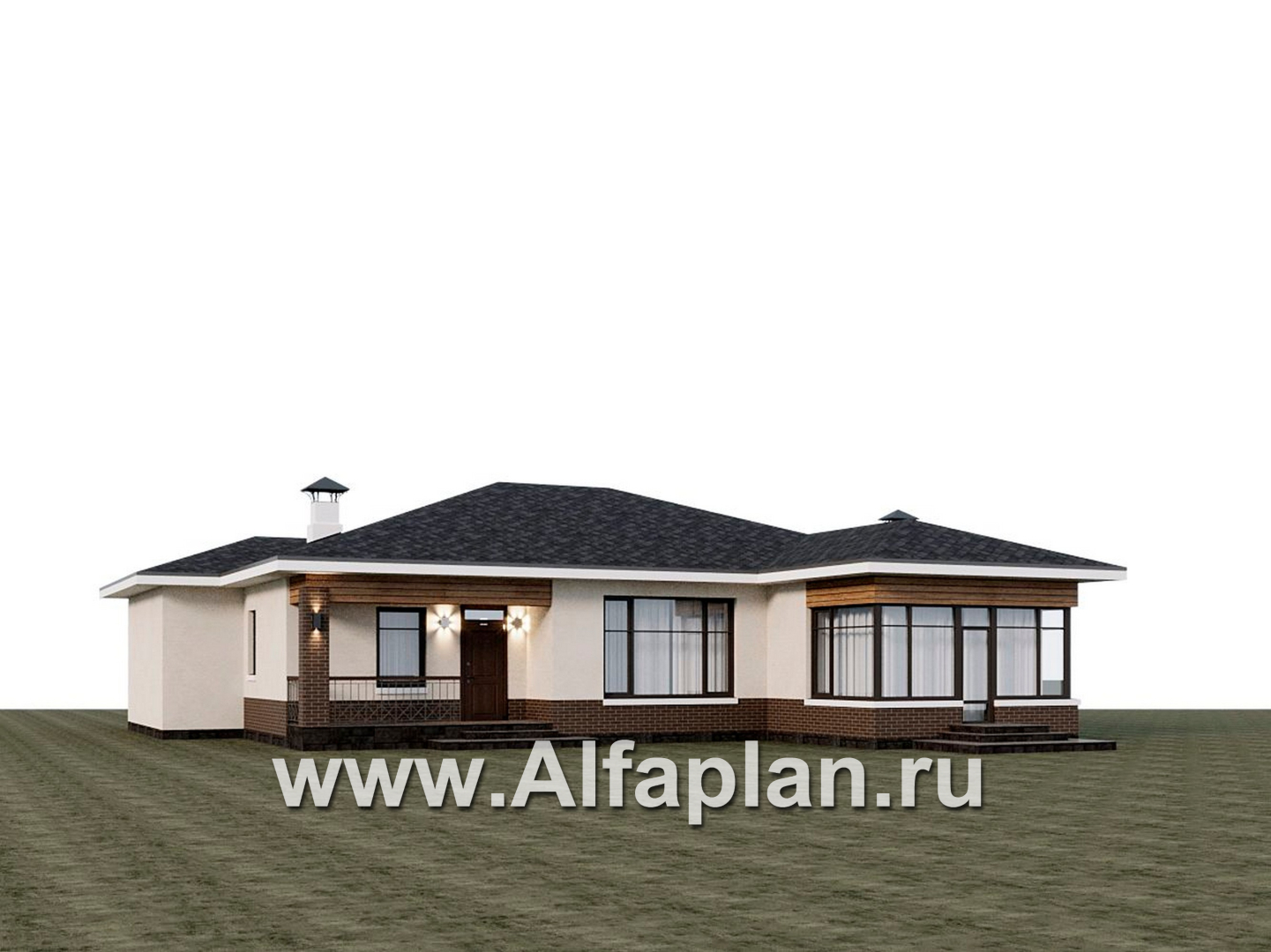 Фасад современного одноэтажного дома 610А «Эрато» запоминается портиком террасы на главном фасаде, и красиво оформленным входом в дом. Традиционно для Альфаплан, облицовка стен, на террасе и возле крыльца, выполнена деревянной вагонкой. Фасады выполнены в отделочном кирпиче.