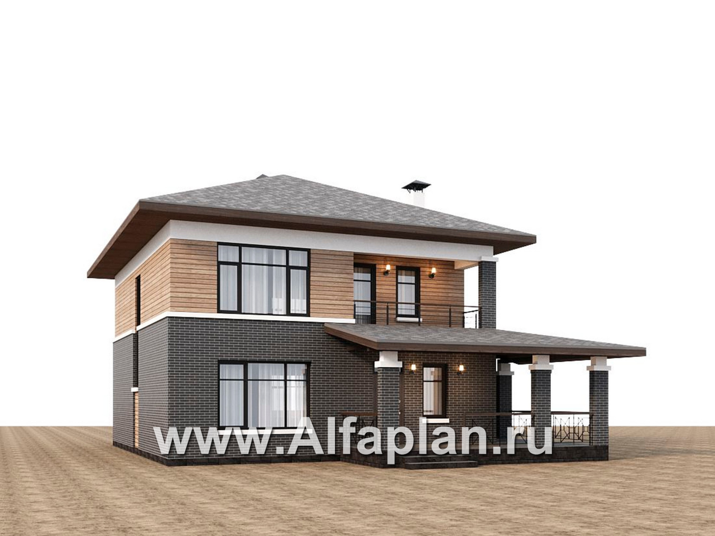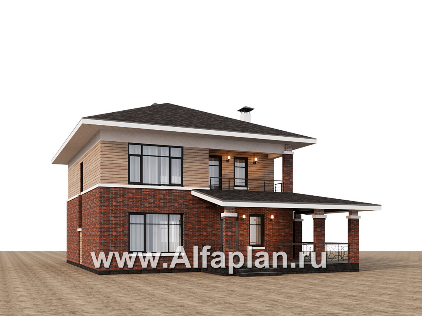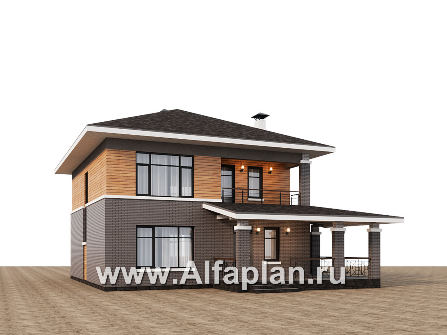 945B «Отрадное» - проект двухэтажного дома из газобетона, в стиле Райта, с террасой на главном фасаде