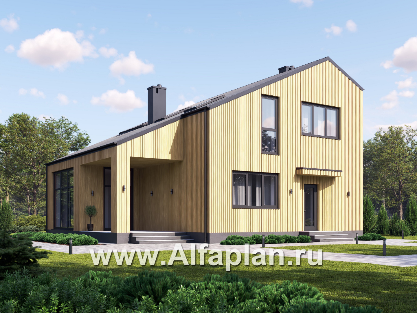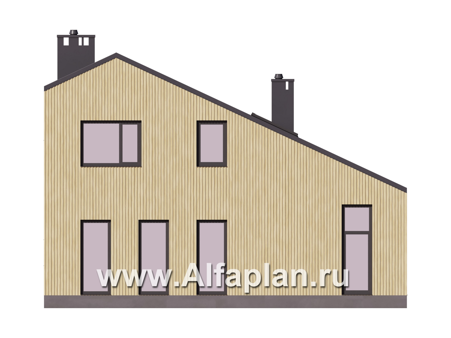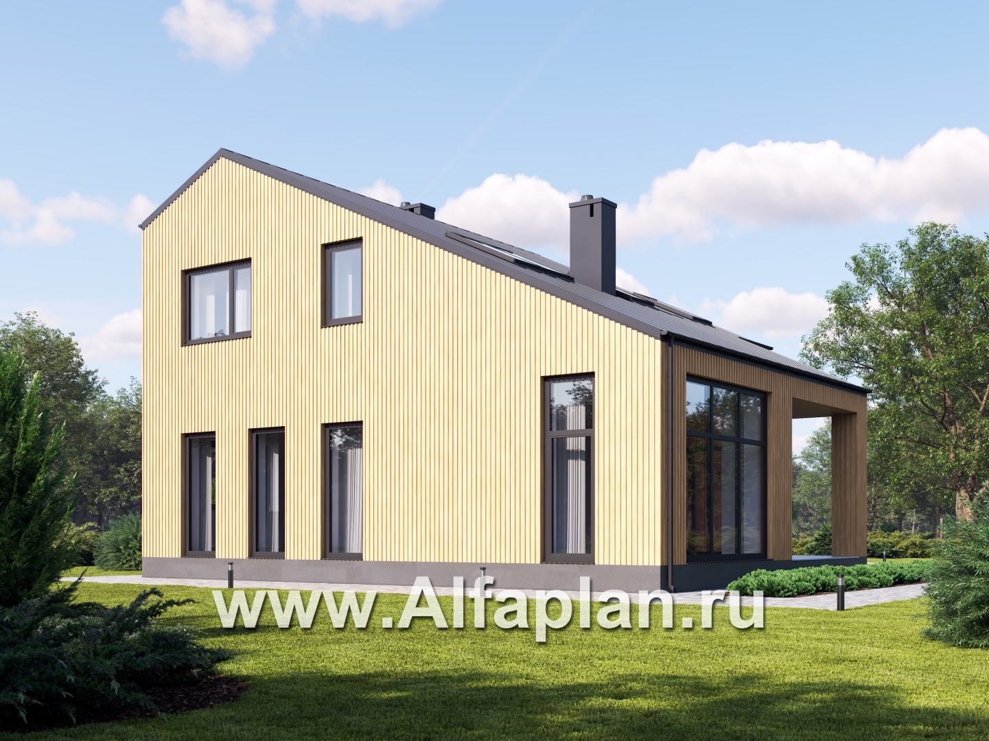 Одно из модных веяний в современной коттеджной архитектуре – это подчеркнутая особенностями декора сложная, эклектичная геометрия фасадов. То же самое можно сказать и о форме кровли, являющейся, по сути, самостоятельным декоративным элементом. Впрочем, постройки, выполненные в минималистичном духе, также не остаются без внимания: это отличное решение для тех, кто стремится подчеркнуть собственную индивидуальность. Представленный здесь проект коттеджа привлекает внимание именно нарочито простыми, геометричными формами. Здесь нет абсолютно ничего, что можно было бы отнести к числу архитектурных красивостей: лаконизм прослеживается и в очертаниях дома, и в декоре фасада – для облицовки выбрана деревянная рейка золотистого оттенка, – и в форме асимметричной скатной кровли.