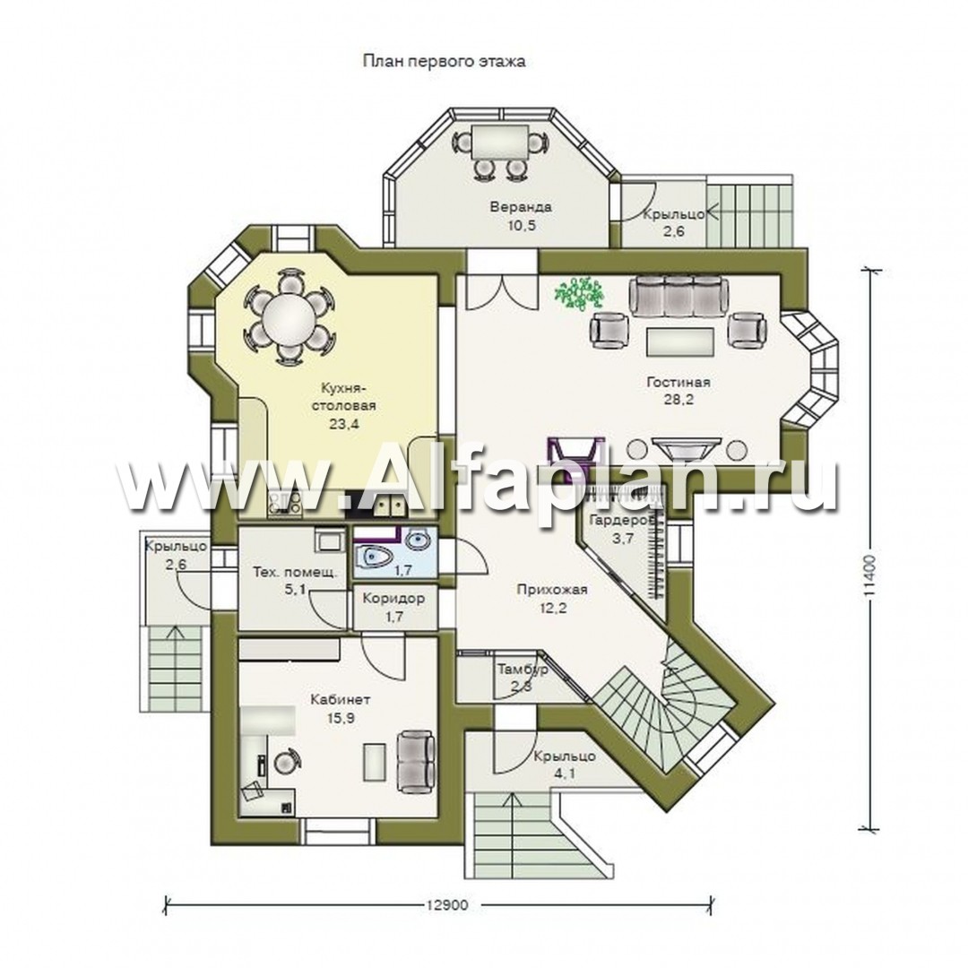 На первом этаже располагается прихожая, гостиная, кухня со столовой, техническое помещение, кабинет, тамбур, гардероб и санузел. Из гостиной есть выход на просторную веранду, откуда можно попасть на задний дворик. В доме предусмотрено целых три входа: центральный, задний и боковой. В этом плане проект уникален.
