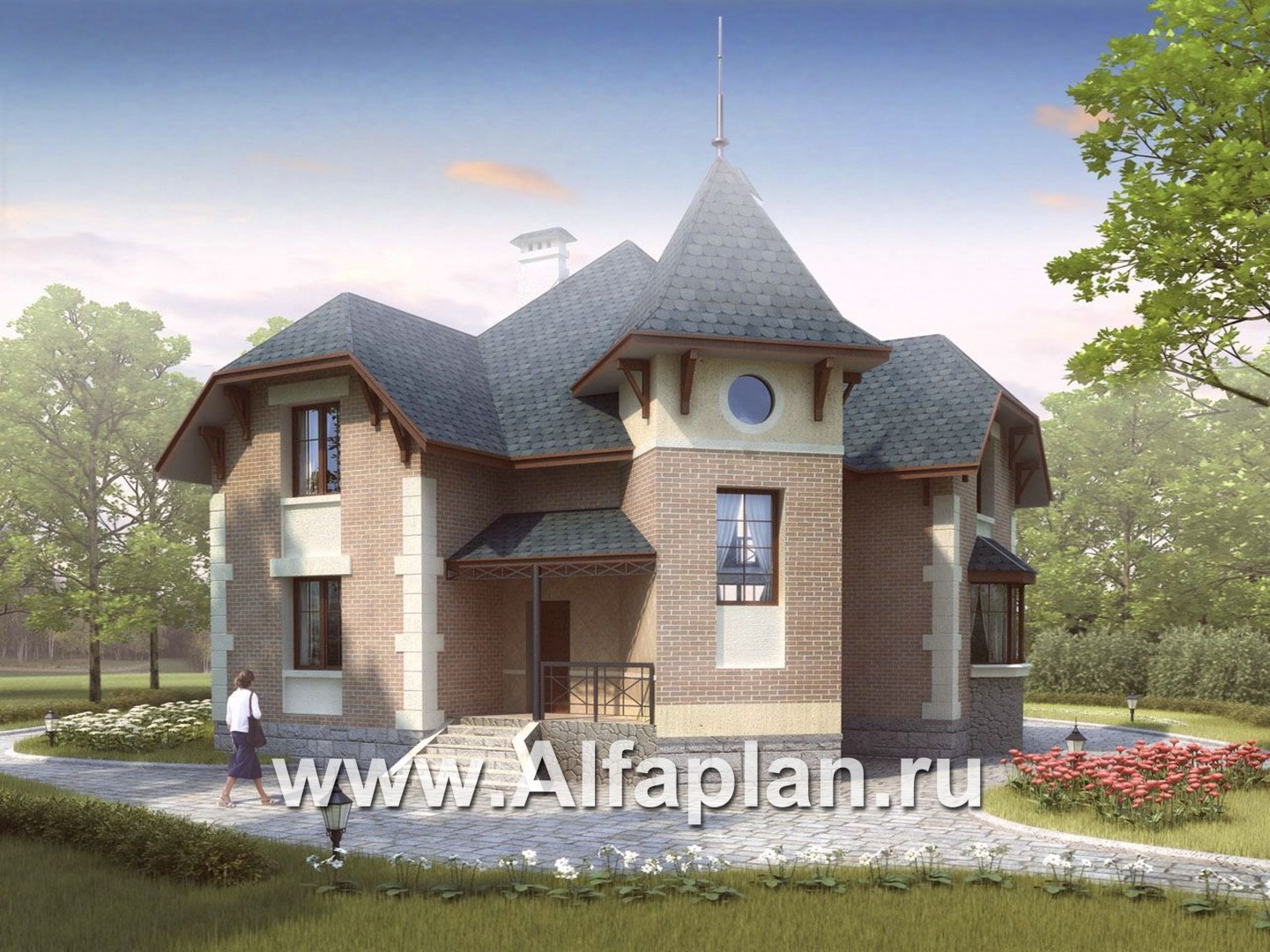«Аскольд» - проект двухэтажного дома с террасой, планировка дома по диагонали, в стиле замка - технические характеристики