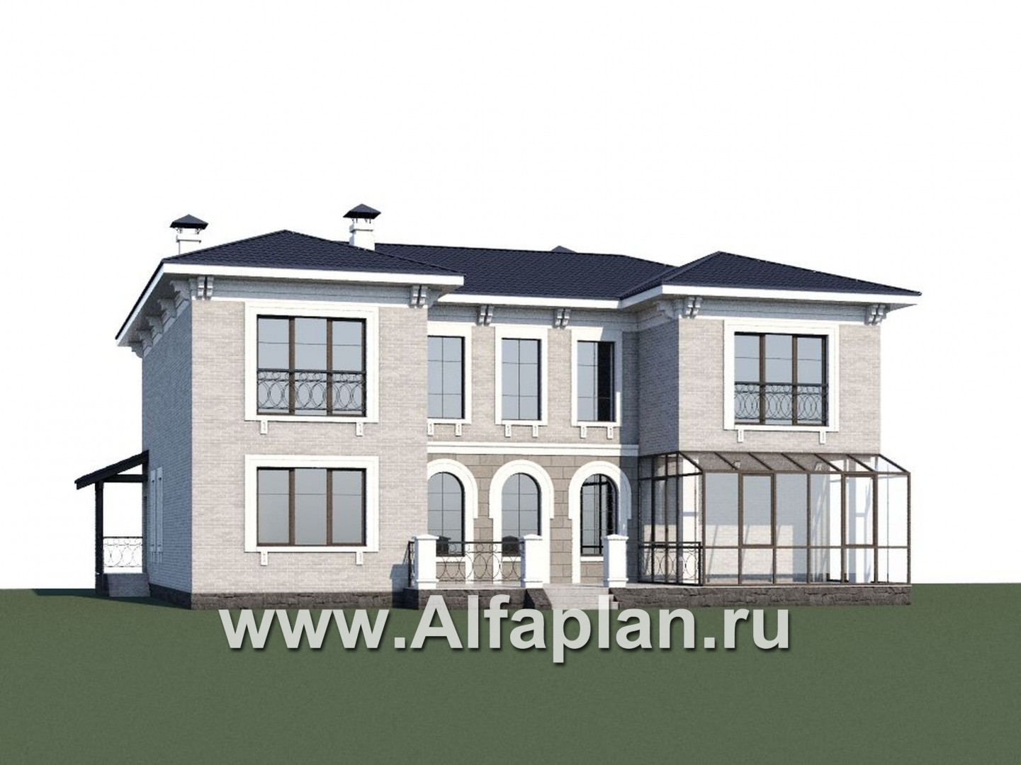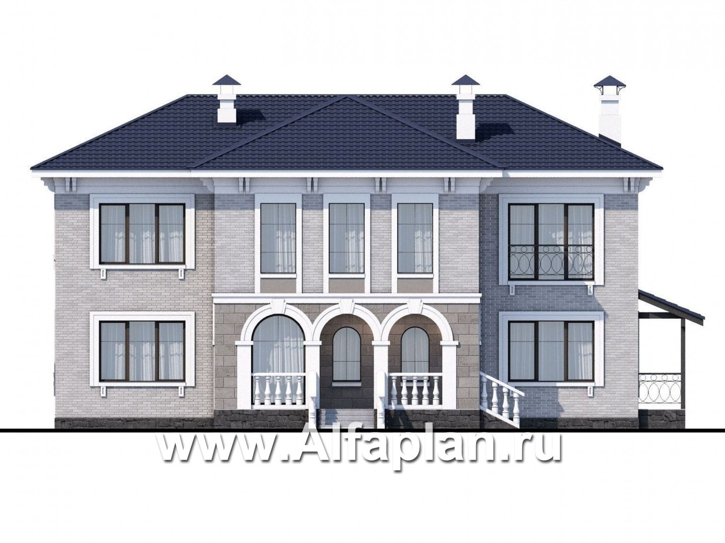 Проект коттеджа в классическом стиле, который не сложно определить благодаря строгости линий и минимальному количеству фасадного декора. Особог внимания заслуживает широкое крыльцо, украшенное арочными проемами, на которое ведут две лестницы: в центре и слевой стороны.