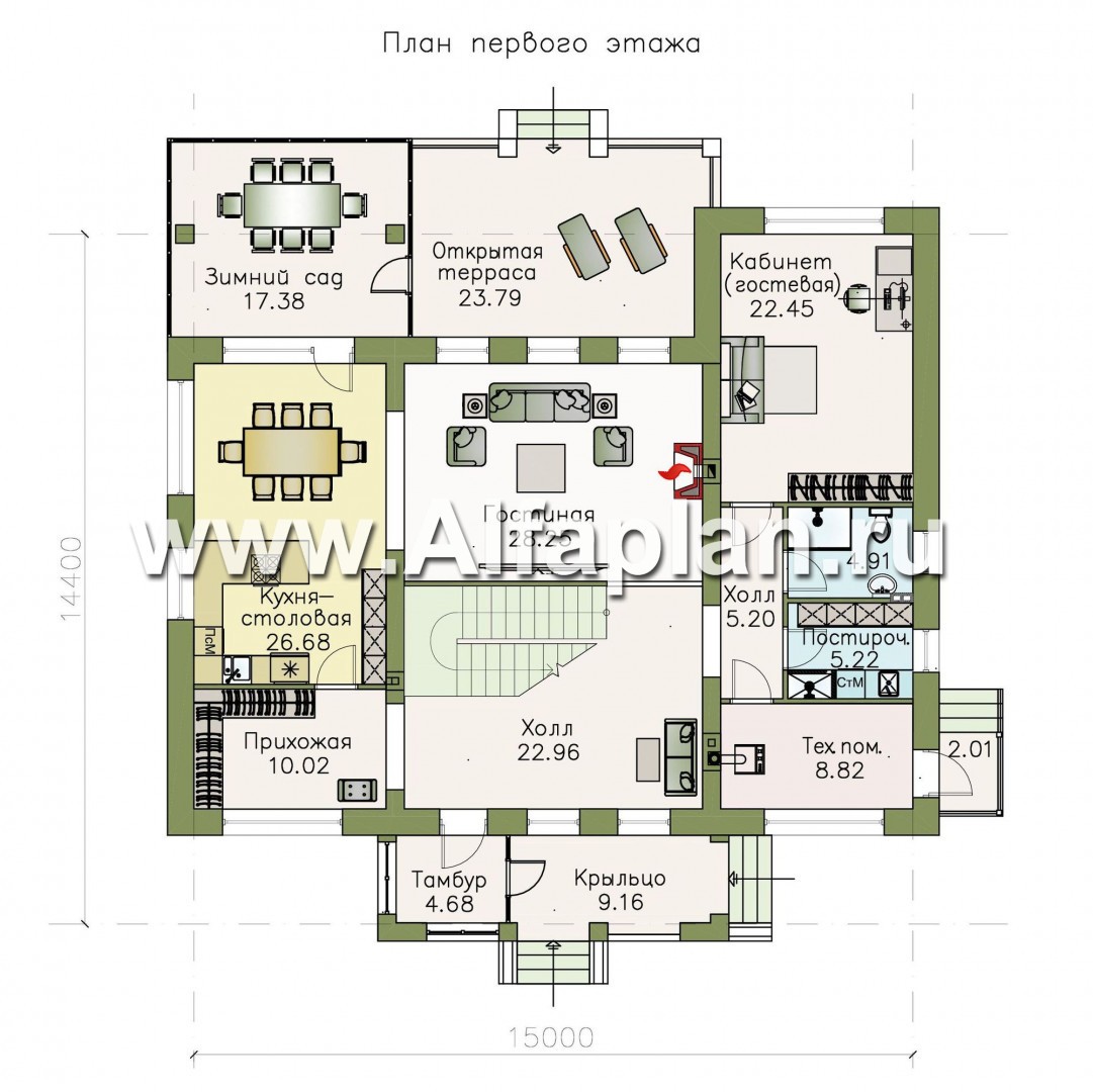 В дом можно попасть через теплый тамбур, сразу за ним находится просторный холл с лестницей на второй этаж и дверью в прихожую, в которой есть два гардероба для верхней одежды. Прихожая соединена с совмещенной кухней-столовой и через нее – с зимним садом. Из большого холла можно попасть в гостиную, соединенную широкой аркой с кухней-столовой и окнами на открытую террасу.