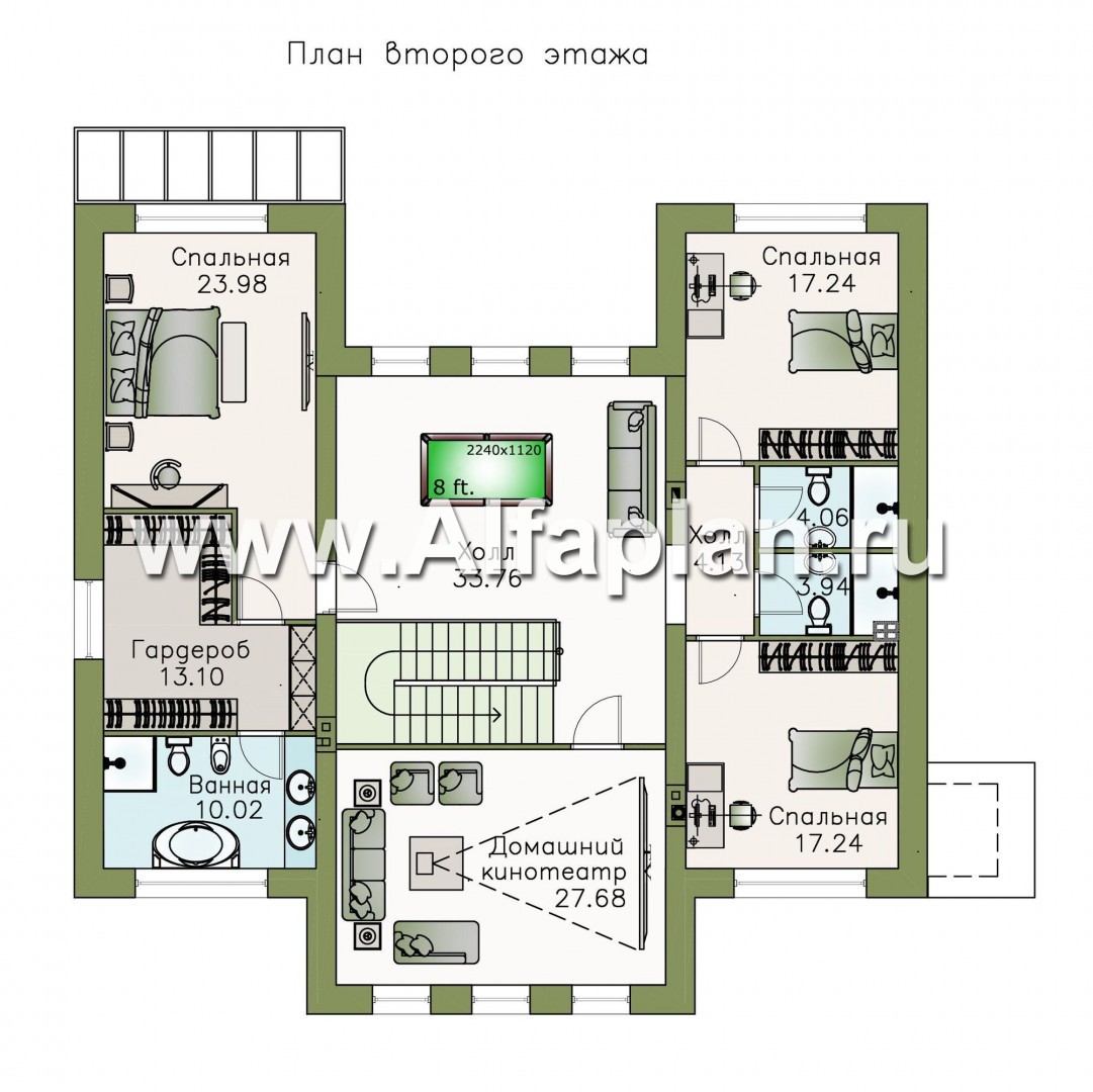 Широкая лестница приводит огромный холл второго этажа с тремя окнами, из которого напрямую можно попасть в холл и помещение меньшего размера. В нем находятся четыре двери: две из них ведут в одинаковые спальни, две – в санузлы. Сразу около верхней лестничной площадки расположен вход в большой изолированный от других помещений кинозал, который при желании можно использовать и для других целей. С правой стороны холла расположена большая спальня с изолированной гардеробной и ванной комнатой.