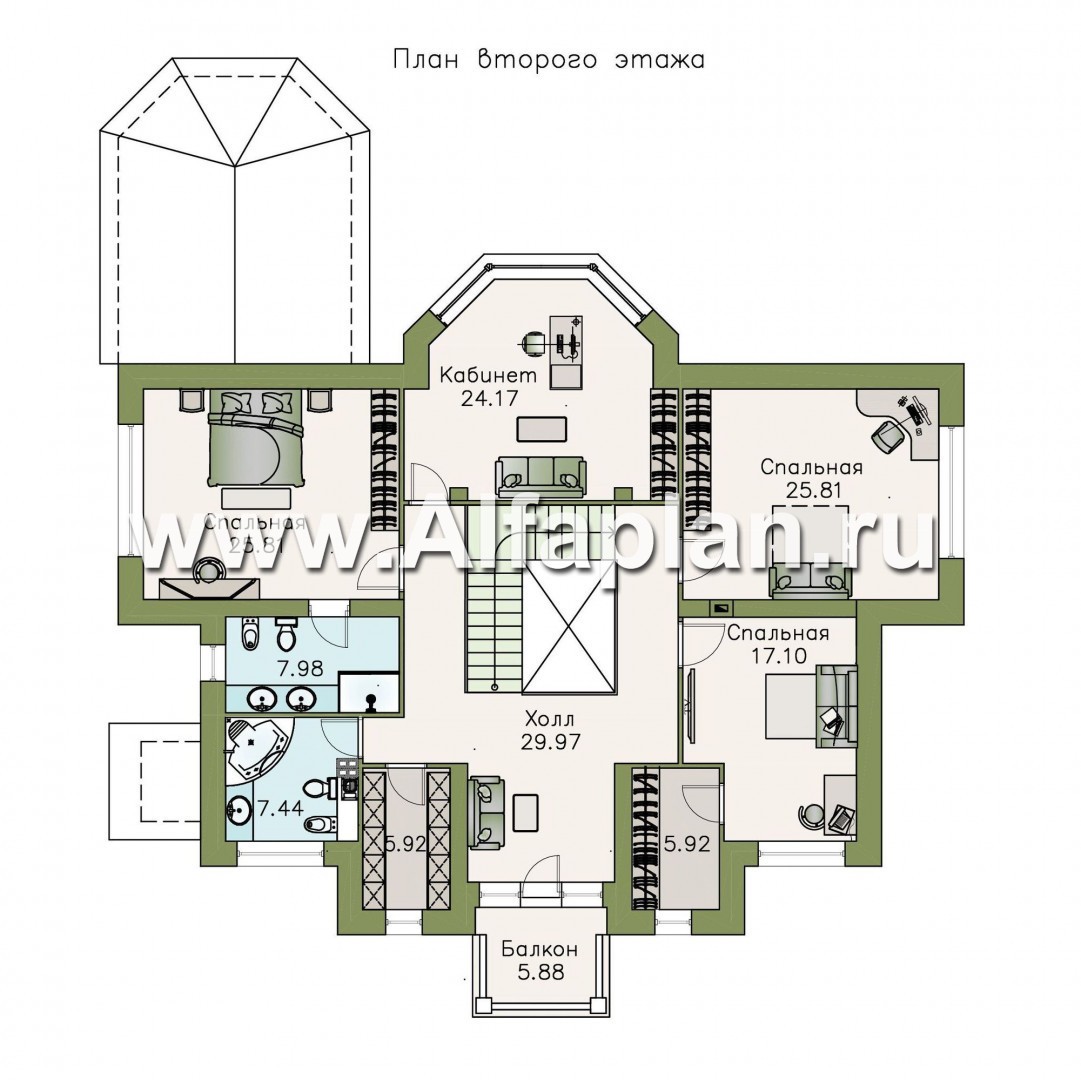 Проект коттеджа повышенной комфортности предусматривает планировку второго этажа с огромным холлом в центре, тремя спальнями и кабинетом. В нем находится панорамное окно на три стороны. В одной из спален есть изолированная гардеробная комната, во второй – отдельный санузел. Их холла второго этажа также можно попасть в ванную комнату с душевой кабиной и в отдельную гардеробную с окном.