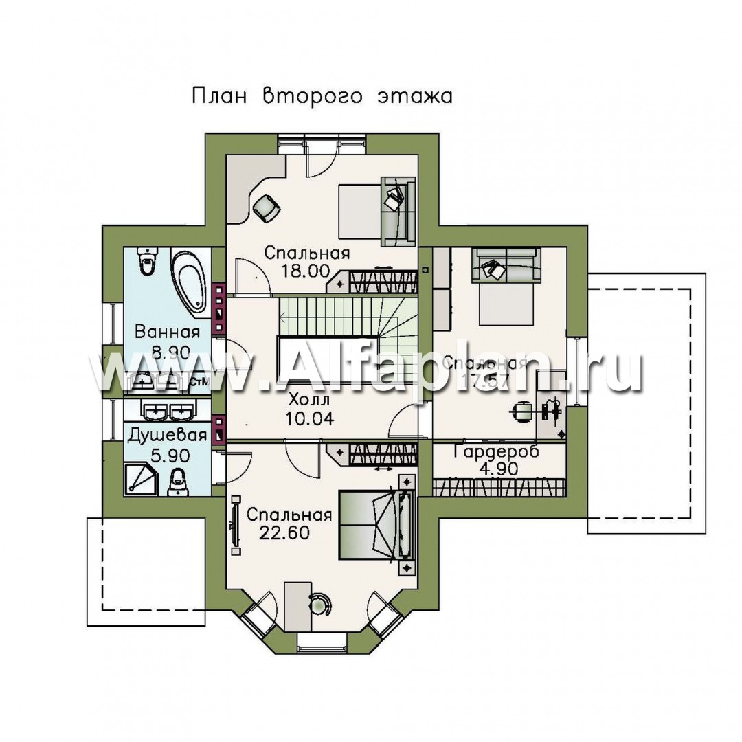 По угловой лестнице поднимаемся на второй этаж — зону отдыха с 3 спальнями, 6-метровой душевой, 9-метровой ванной и холлом площадью 10 м². Спальня площадью 18 м² дополнена гардеробной зоной и окном с видом на террасу. Вторая спальня площадью 18 м² оснащена большим окном. Над спальней площадью 23 м² c эркерной стеной — крыша в форме многогранника акцентирует внимание на внешнем виде коттеджа.