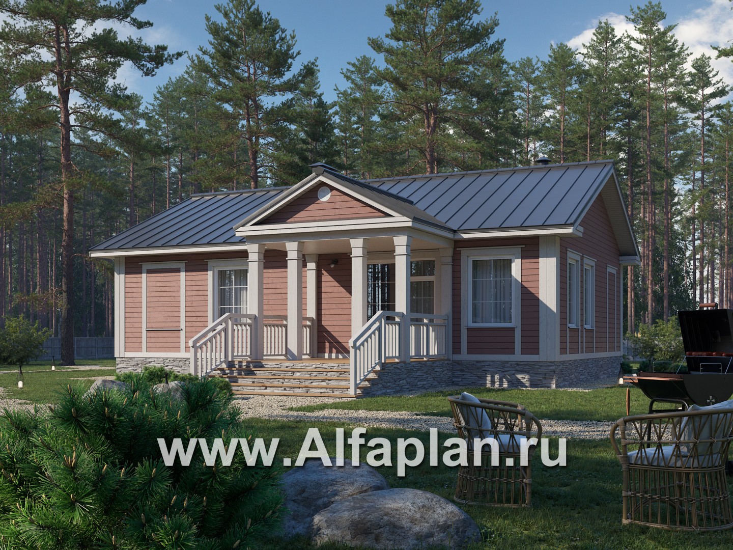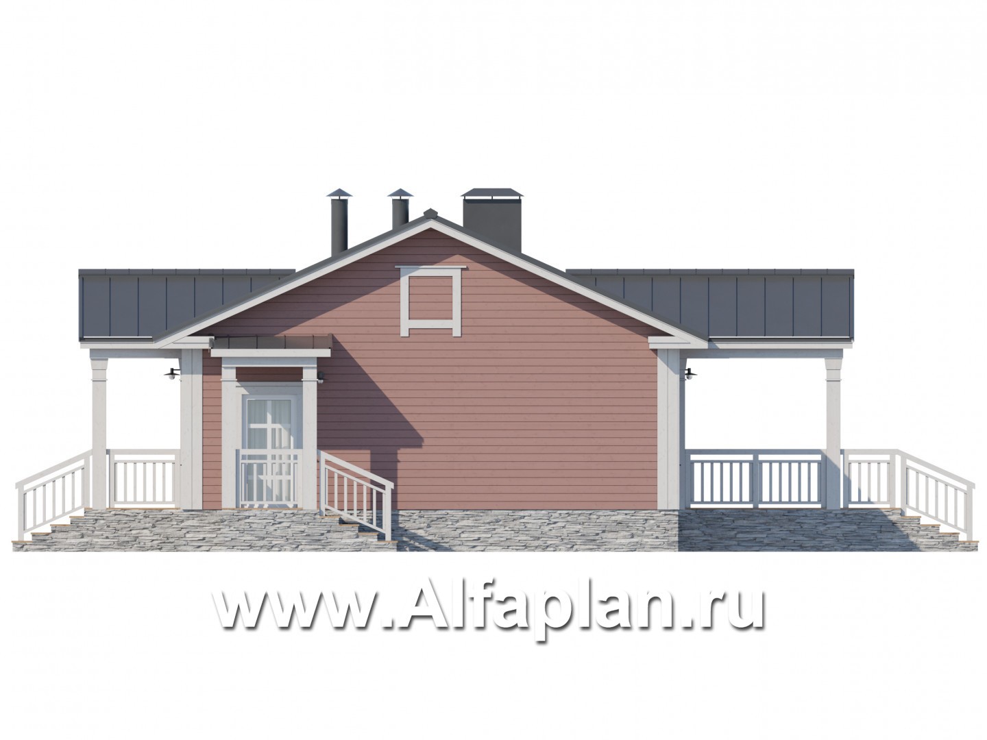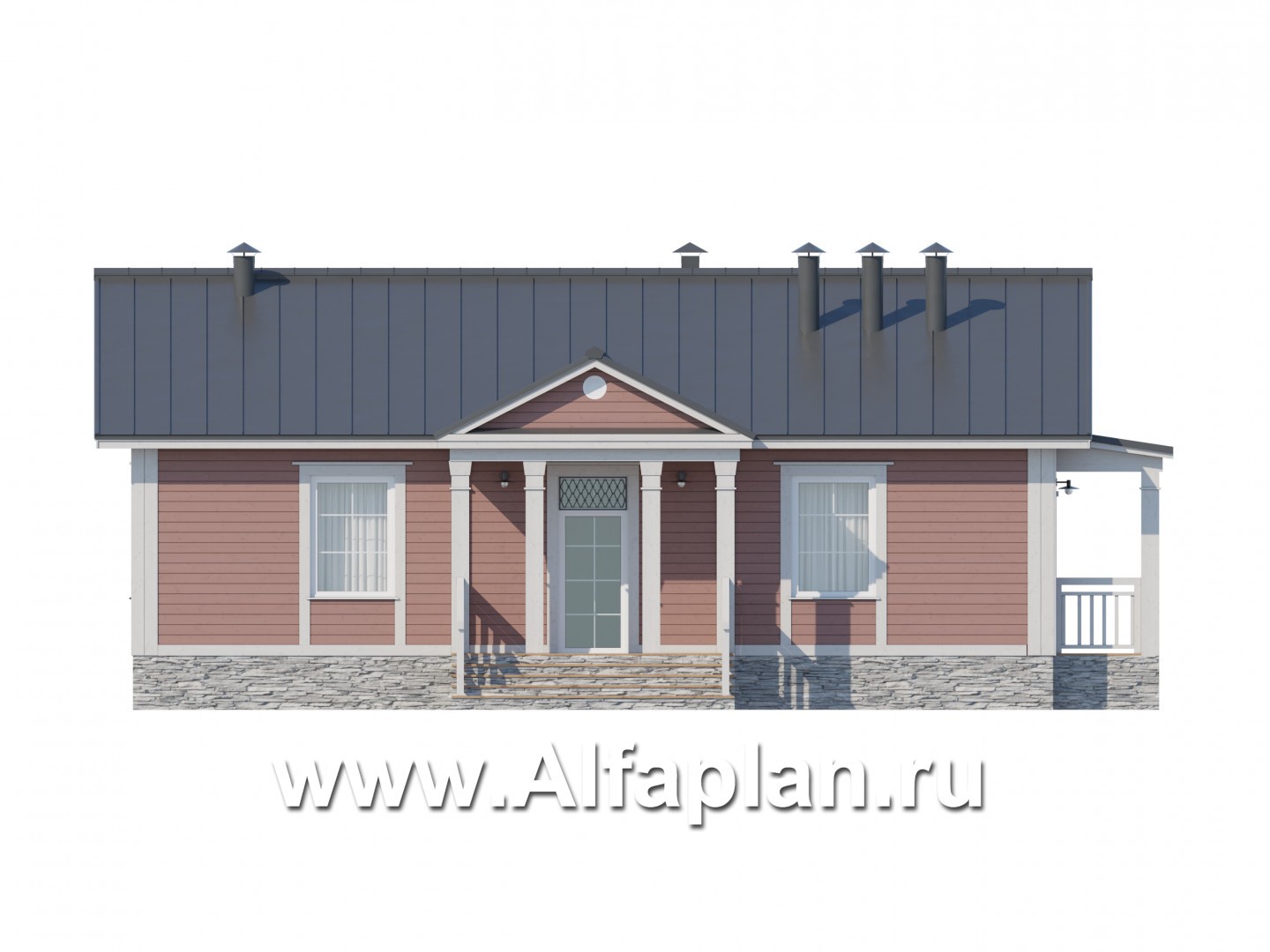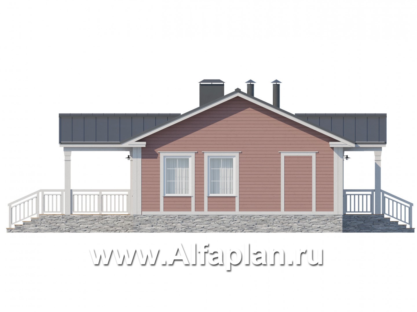 Проект каркасного одноэтажного дома, с террасой, 2 спальни, в классическом стиле