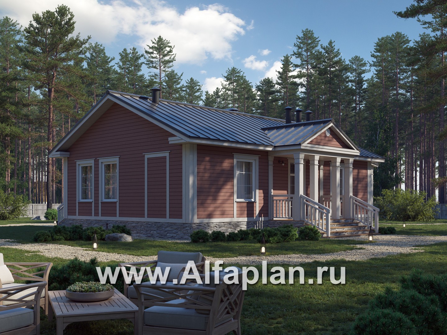 E-100-F Проект каркасного одноэтажного дома, с террасой, 2 спальни, в классическом стиле