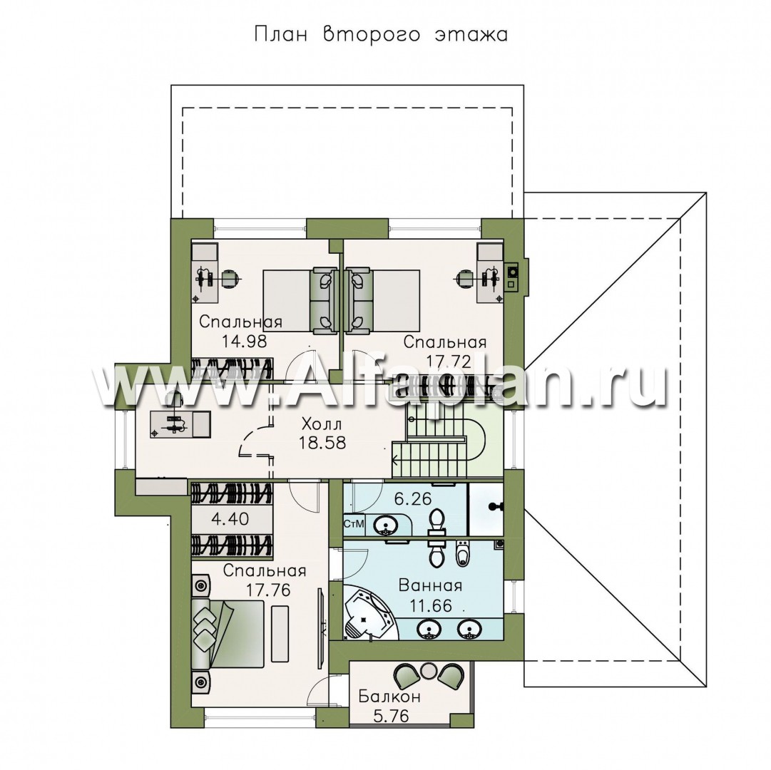 Большой двухэтажный коттедж с пристроенным гаражом под один автомобиль и просторной крытой террасой непременно придется по душе семье, состоящей из трех и более человек. Здесь есть четыре спальни, расположенные на втором этаже. Это очень удобно, так как можно разместить гостей, которые остаются ночевать. Если четыре спальни для вас много, одну или две из них можно переделать под личный кабинет, детскую или иную, нужную комнату. Также на втором этаже есть просторная ванная и санузел.