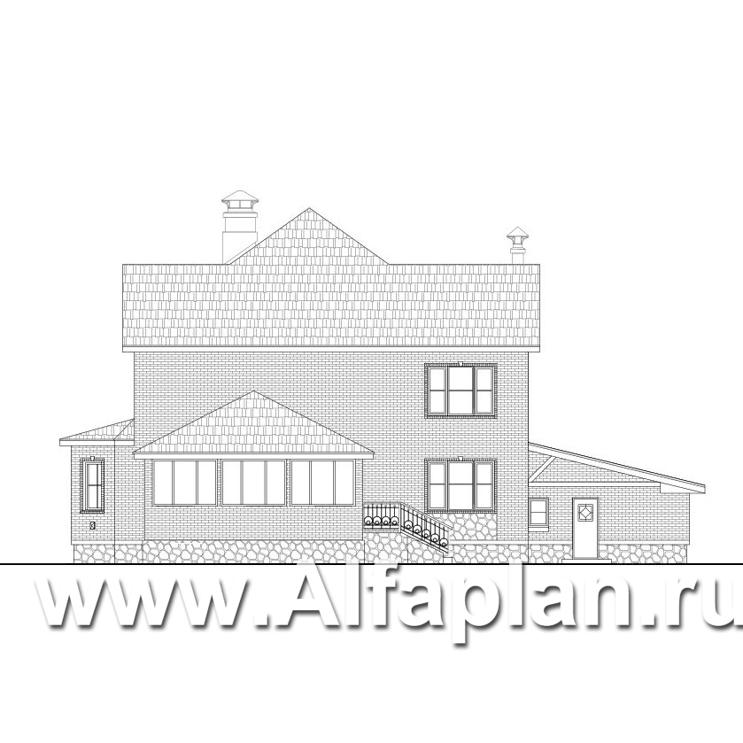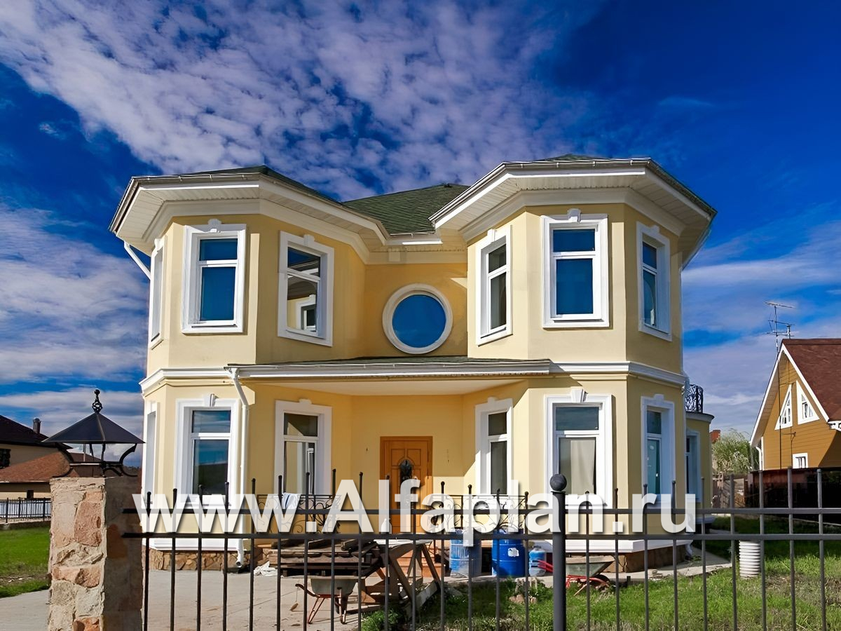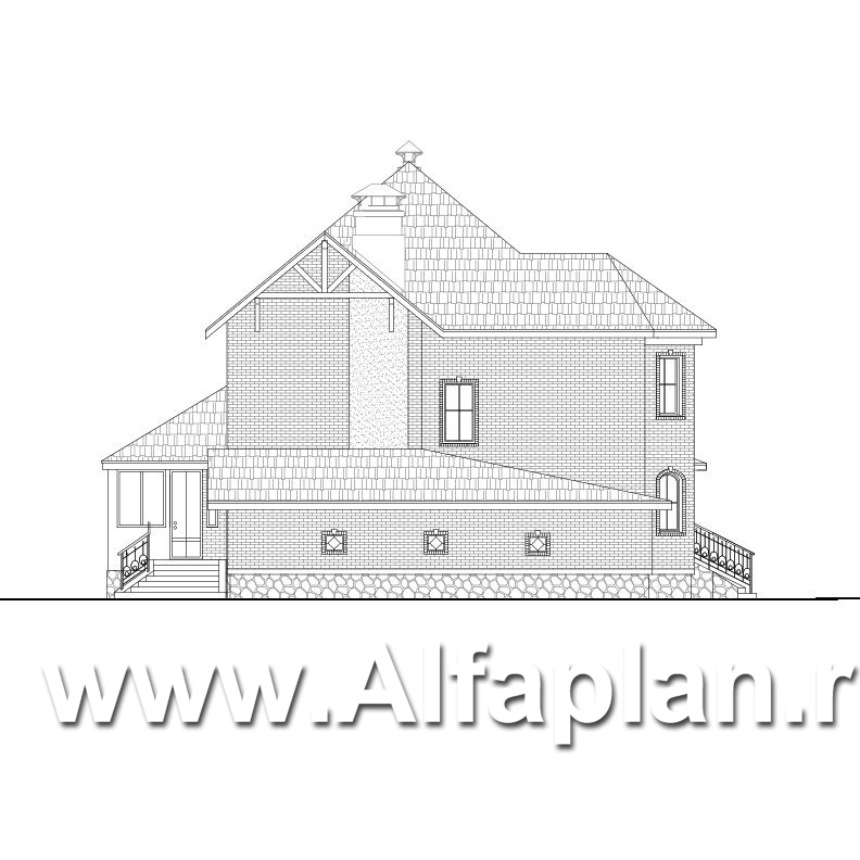 349B «Амбиент» - проект двухэтажного дома с двумя эркерами в стиле замка, с террасой и с гаражом